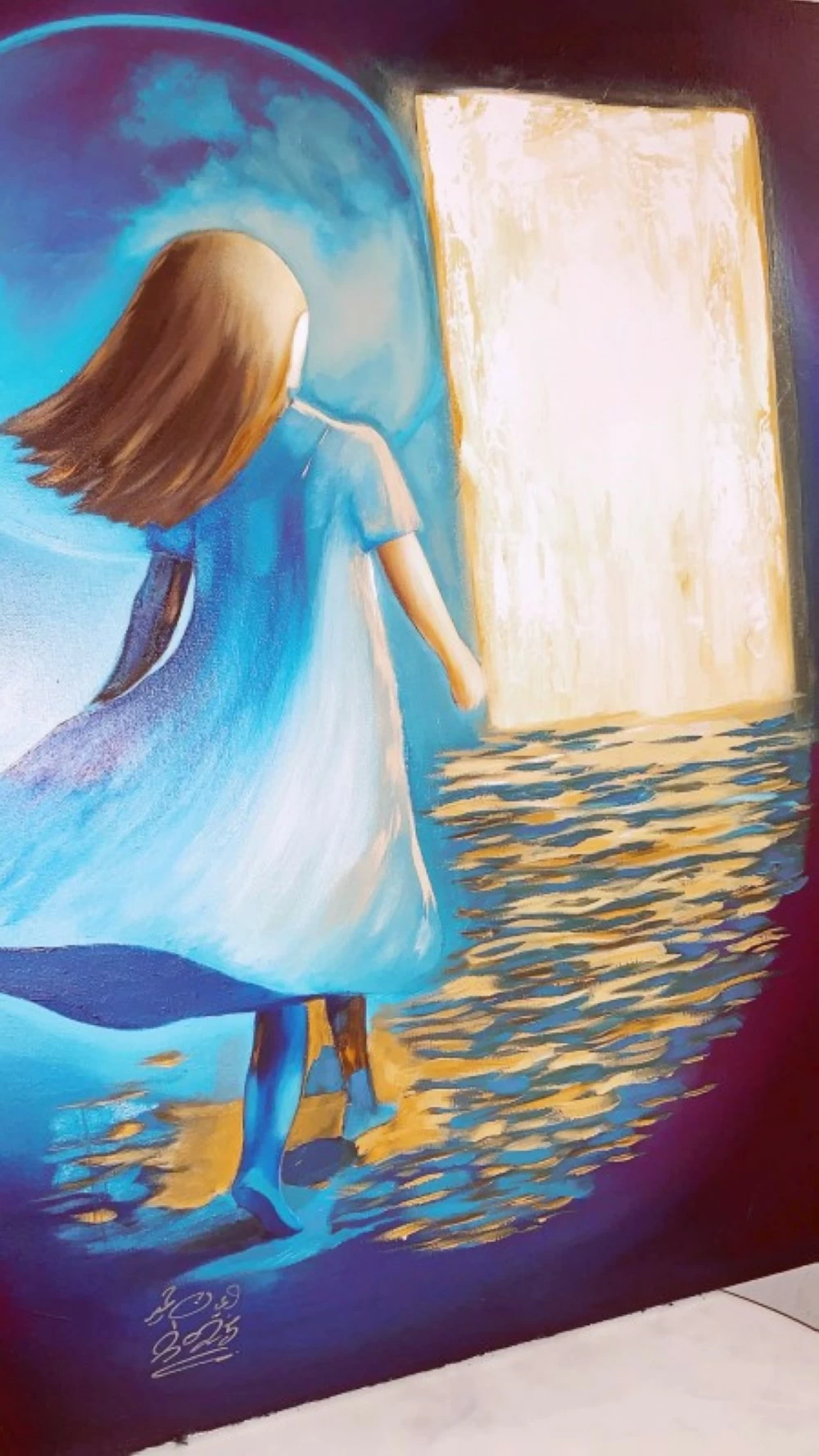 The work is executed in oil on canvas measuring 80×80 cm, and it is based on a visual balance between blue and gold; the blue symbolizes clarity and tranquility, while the gold seeps in as an inner light suggesting understanding after the storm. At the center of the painting, a girl appears moving towards the light, in a symbolic scene that reflects learning from experience without excessive narration.