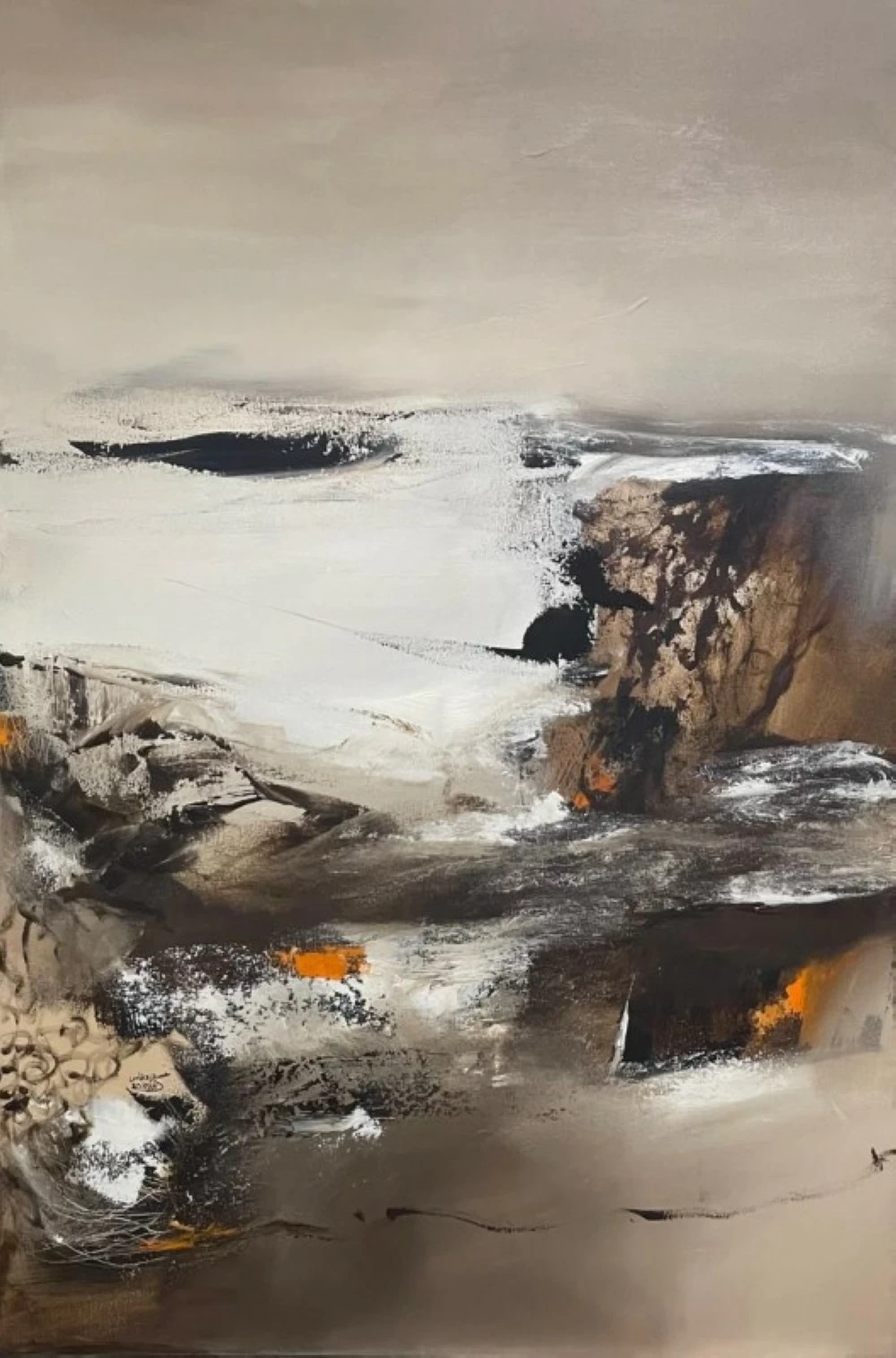 In the space of the exhibition, the paintings breathe slowly as if they are emotional states that change with the shifting light. The shades of gray and white whisper tranquility while the orange spots ignite like a sudden warmth in the coldness of the spaces, while green and purple scatter with a spiritual balance that hints at clarity. Here, color is not a decorative element but a living entity that speaks the language of emotions, narrating what words fail to express and granting the viewer the wonder of initial discovery.