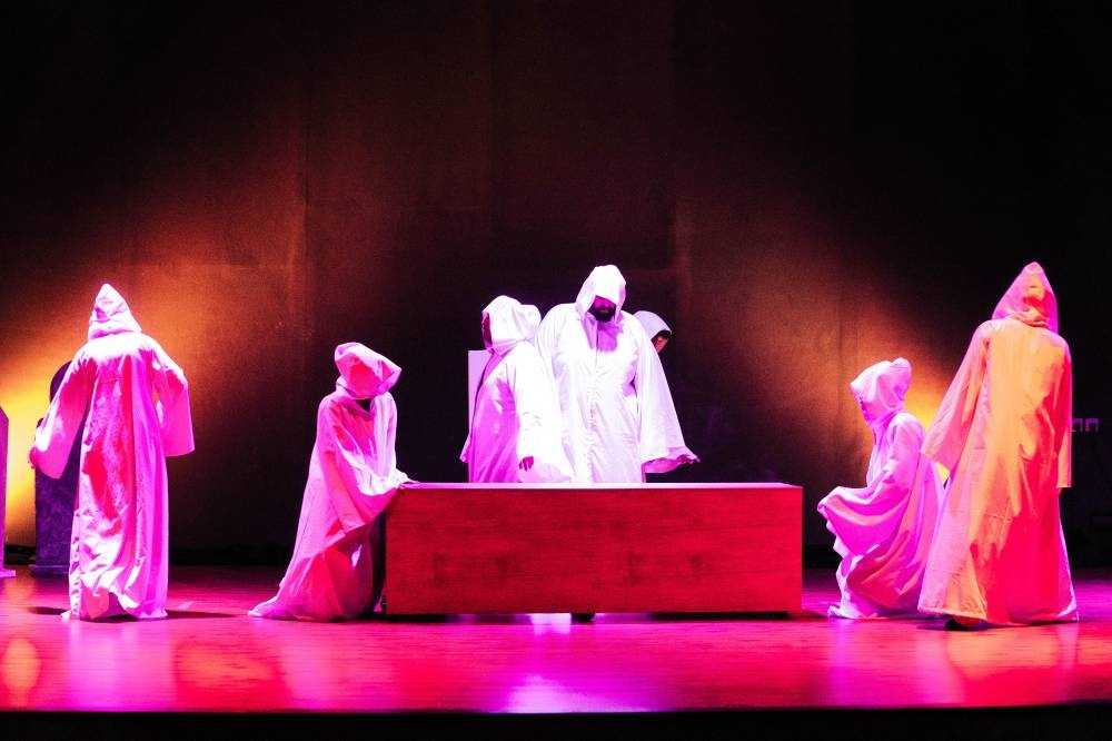 مخرج العمل المسرحي متعب آل ثواب أكد لـ«عكاظ» أنّ رؤيته الإخراجية لنص «البرزخيون» انطلقت من خليط بين الواقعية والتعبيرية فعمدت إلى تأثيث الفضاء المسرحي على شكل مقبرة واقعية، لكون «البرزخ» مكاناً غيبياً لا يمكن تصوره أو تحديد موقعه، لذلك رأى أن يعيد شخصيات العمل التي فارقت دنيانا إلى المحطة الأخيرة التي شوهد الجميع فيها.