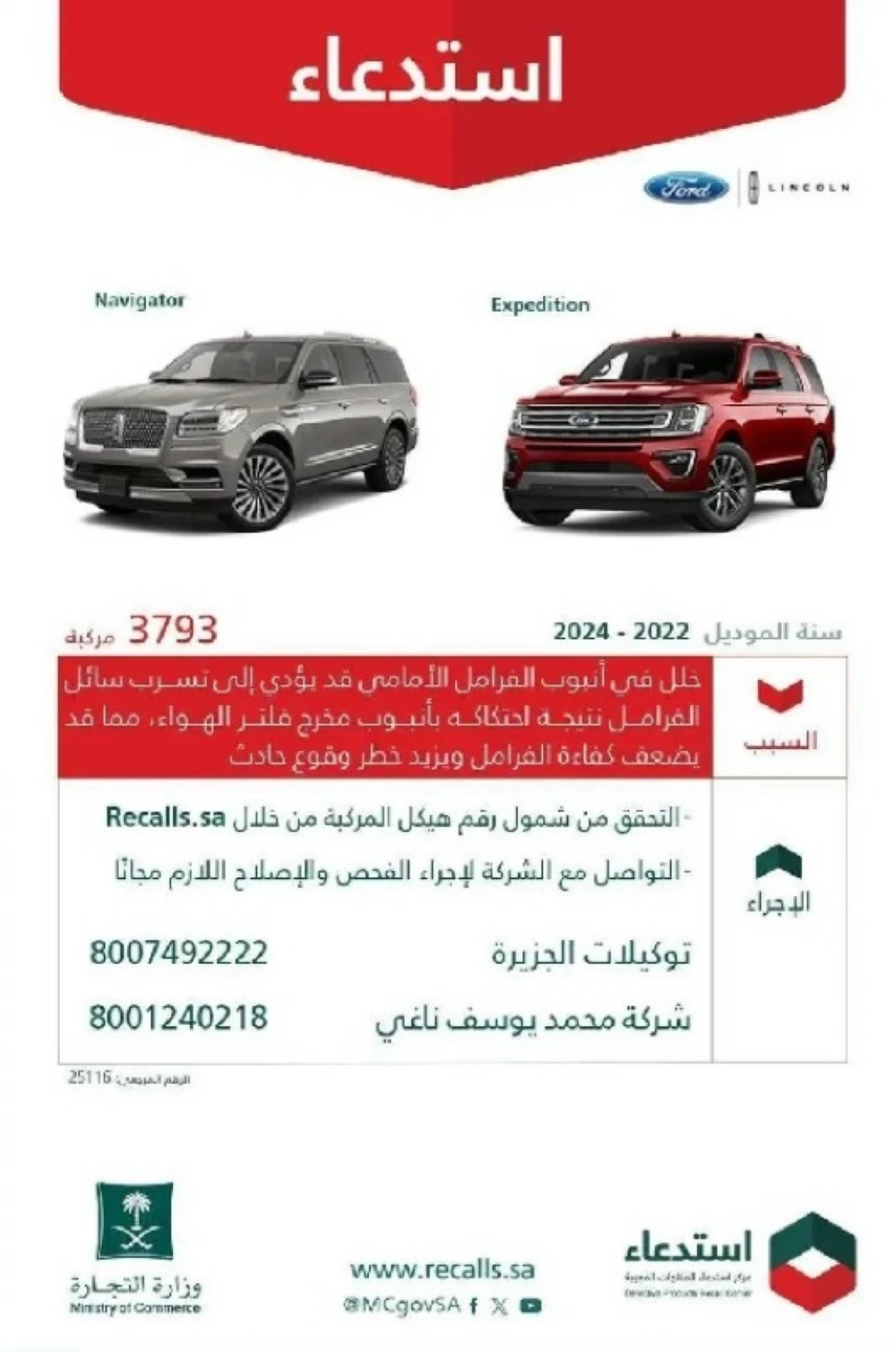 استدعت وزارة التجارة (3,793) مركبة (لينكون – Navigator) و(فورد – Expedition) لسنة الصنع (2022 إلى 2024)، لخلل في أنبوب الفرامل الأمامي، قد يؤدي إلى تسرب سائل الفرامل نتيجة احتكاكه بأنبوب مخرج فلتر الهواء؛ مما يُضعف كفاءة الفرامل ويزيد خطر وقوع حادث.