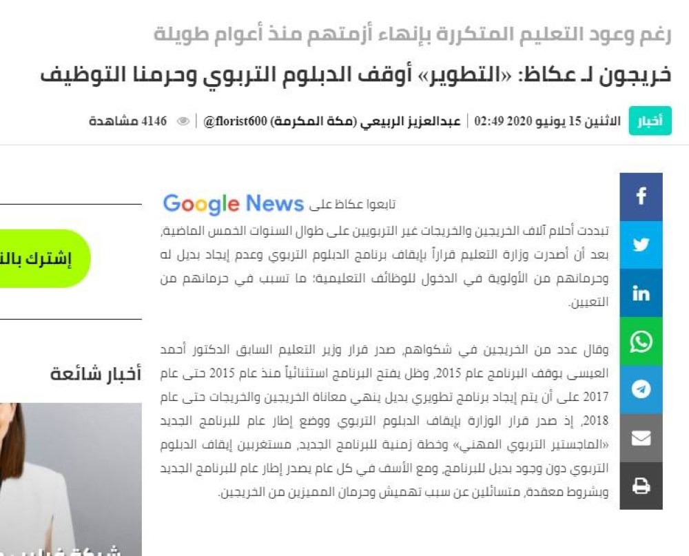وناشد محمد العتيبي وعلي العمري نواف عبدالله، وزير التعليم، بالنظر في ما وقع عليهم من «تهميش غير مبرر» -حسب وصفهم- والمسارعة برفع الضرر عنهم ووضع الحلول الممكنة، «استوفينا جميع متطلبات ومعايير التعيين على وظيفة معلم وحال دون تحقيق طموحنا شرط غير متاح وهو الدبلوم التربوي، هذه العقبة تقف على طريقنا منذ سنوات دون حلول مجدية» ويتساءل الخريجون: «ما ذنب طموحاتنا حينما تتعثر بشرط مفقود؟ أليس من حقنا أن نصبح معلمين ومعلمات؟ أليس من حق أسرنا أن يروا حلمنا واقعاً؟! كم عانوا وتكبدوا من أجلنا وكم قطعوا من طرق من أجل إيصالنا لجامعاتنا! واليوم يتحسرون على حرماننا من فرص بقدر قربها منا واستيفائنا لمعاييرها إلا أنها تظل مستحيلة بسبب الشرط المفقود منذ سنوات».