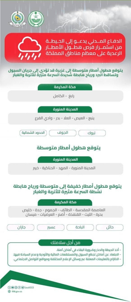 وأوضحت أن منطقة مكة المكرمة ستتأثر بأمطار متوسطة إلى غزيرة قد تؤدي إلى جريان السيول وتساقط البرد ورياح هابطة شديدة السرعة مثيرة للأتربة والغبار تشمل رابغ والكامل، كما يُتوقع أن تتأثر منطقة المدينة المنورة لتشمل ينبع والعيص والعلا وبدر ووادي الفرع، ومناطق تبوك والجوف والحدود الشمالية، كما يُتوقع هطول أمطار متوسطة على منطقة المدينة المنورة، تشمل المدينة المنورة والمهد والحناكية وخيبر.