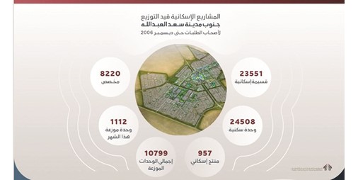 وحسب التقرير فإن المشاريع الاسكانية قيد التوزيع في جنوب مدينة سعد العبدالله لأصحاب الطلبات حتى ديسمبر 2006 بلغت 23551 قسيمة اسكانية و24508 وحدات سكنية و957 منتجا اسكانيا وان اجمالي الوحدات الموزعة بلغ 10799 وحدة سكنية، وبلغ اجمالي عدد المخصصين 8220 مواطنا واجمالي عدد الوحدات الموزعة خلال هذا الشهر 1112 وحدة.