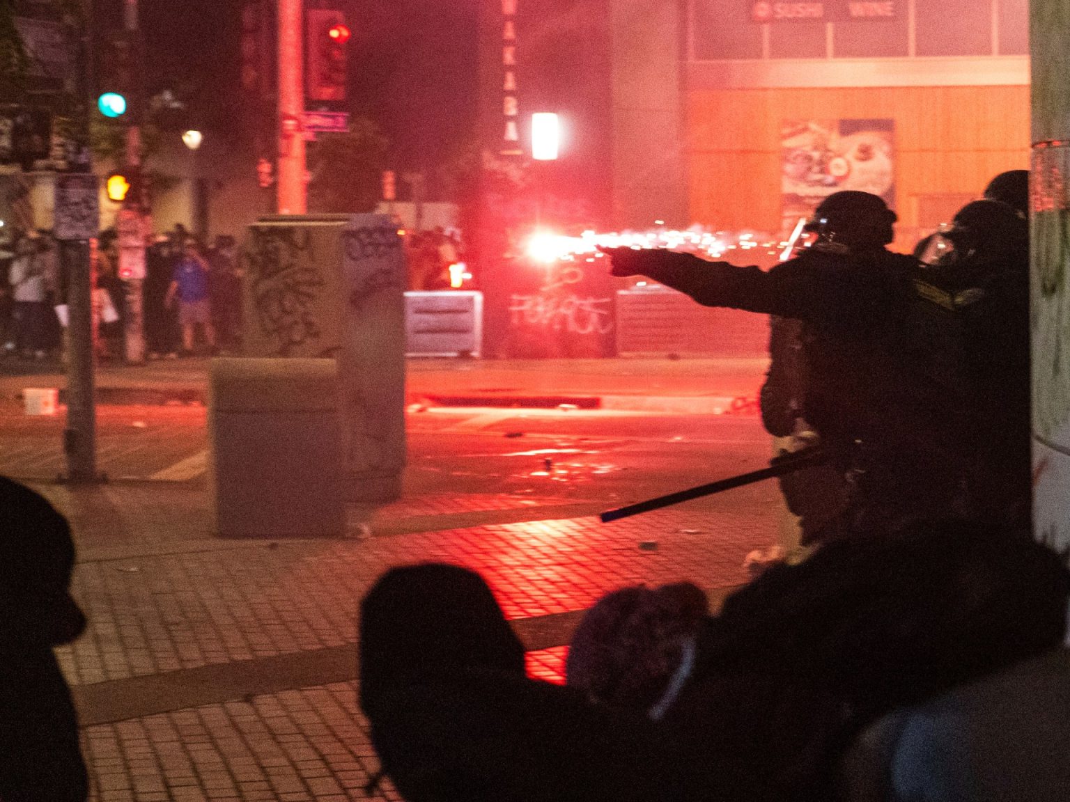 وشكلت قوات الحرس الوطني حاجزا بشريا لإبعاد الناس عن المبنى. ثم تحركت كتيبة من الشرطة في الشارع، ودفعت الناس من مكان الحادث وأطلقت ذخائر “أقل فتكا” مثل قنابل الغاز. وتستخدم الشرطة تكتيكات مماثلة منذ يوم الجمعة.