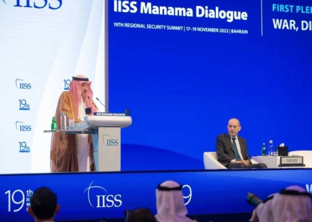 وأكد أن المملكة ستستمر في حشد الجهود لإطلاق سراح الأسرى والمحتجزين وإعادة إحياء جهود السلام العادل والشامل، مشدداً على أن السعودية «ستواصل حشد الجهود من أجل وقف فوري لإطلاق النار وفك الحصار المفروض على غزة»، منوهاً إلى أن هذه الدورة من حوار المنامة تنعقد في ظل أحداث مدوية تعصف بالمنطقة، حيث يقف الجميع شهوداً أمام جرائم بشعة تنتهك مبادئ وأعراف النظام الدولي، واعتداءات عسكرية شعواء تخلّف الآلاف من الضحايا، مشيراً إلى أن استمرار هذه الحرب وإطالة أمدها يفضي إلى كارثة إنسانية لا مبرر لها.