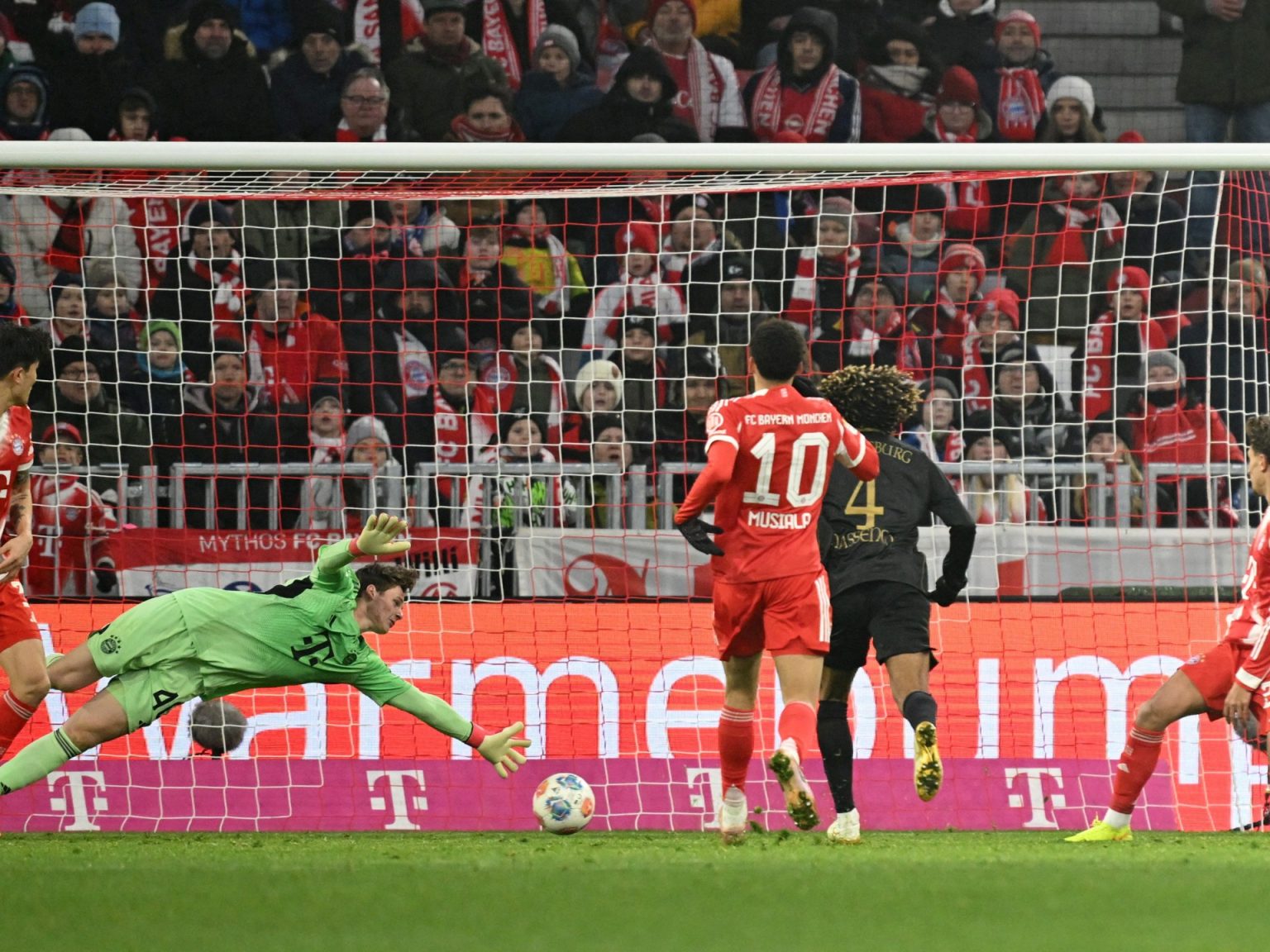 وفي الدقيقة 75، تمكن آرثر تشافيس من إدراك التعادل لأوغسبورغ برأسية قوية، أعادت الأمل للفريق الضيف. ولم يكد بايرن يستفيق من هذا الهدف، حتى تلقى الضربة القاضية في الدقيقة 81، عندما سجل هان-نواه ماسينغو هدف الفوز من مسافة قريبة، بعد تمريرة عرضية متقنة من ديميتريس يانوليس. هذا الهدف أشعل جنون الفرح في صفوف لاعبي أوغسبورغ وجماهيره، بينما ساد الصمت والذهول في ملعب أليانز أرينا.