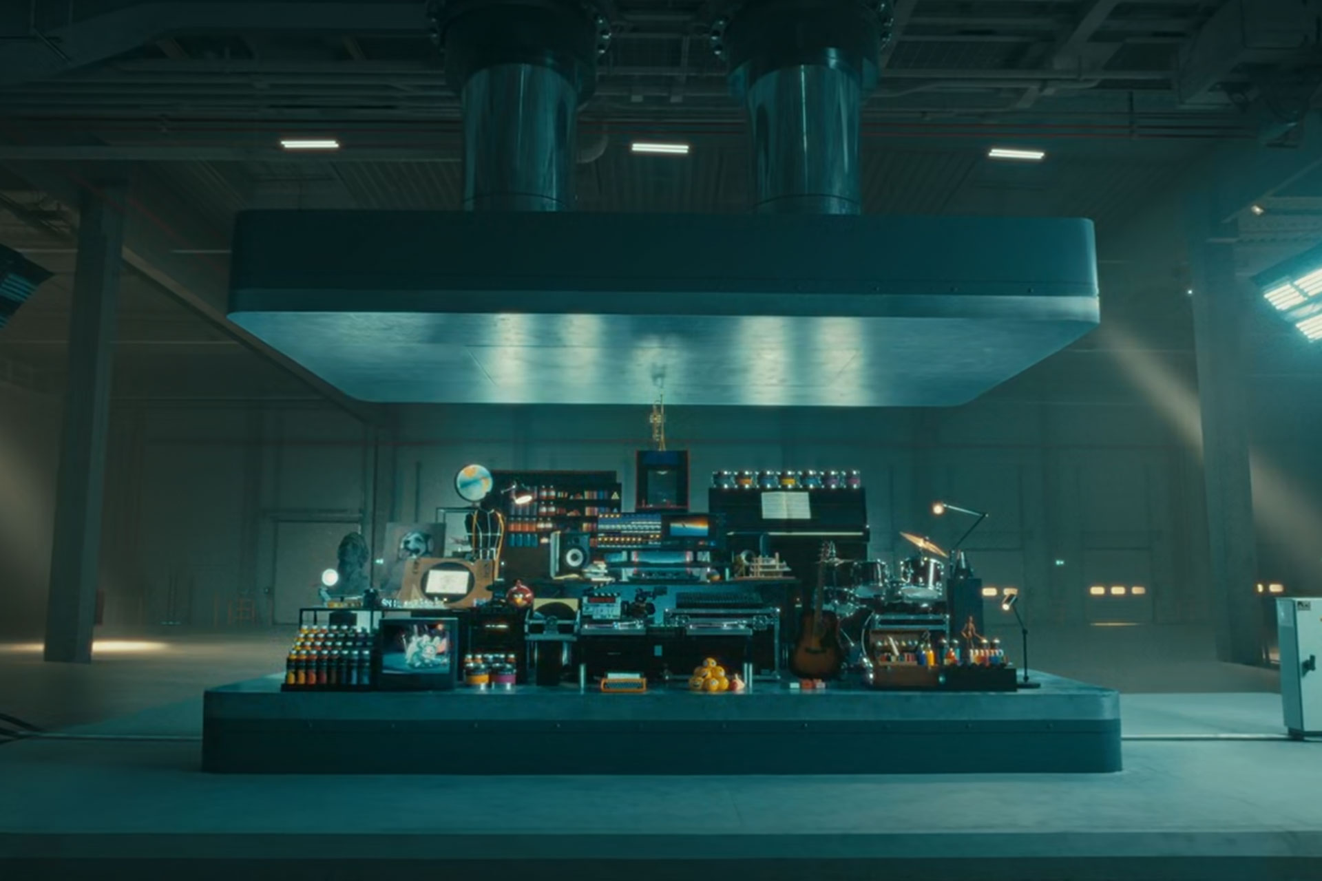 ثم يرتفع المكبس ليظهر جهاز “آي باد برو” بدلا من الآلات الموسيقية والأدوات الإبداعية الأخرى.