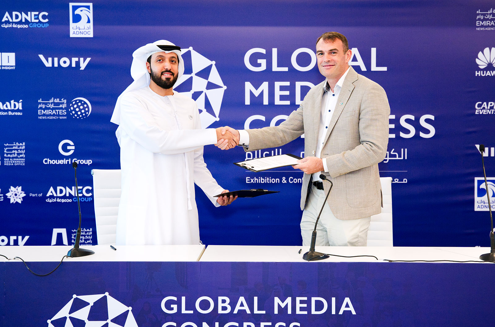 وقع اتفاقية الشراكة الاستراتيجية بين الجانبين كل من حسين العتولي مدير أكاديمية الإعلام الجديد، وأندرو جاكسون، نائب الرئيس التنفيذي والمدير التنفيذي للذكاء الاصطناعي في شركة «كور 42»، خلال فعاليات النسخة الثانية من الكونغرس العالمي للإعلام 2023 التي تنظمها مجموعة «أدنيك» بالشراكة مع وكالة أنباء الإمارات «وام» في أبوظبي.