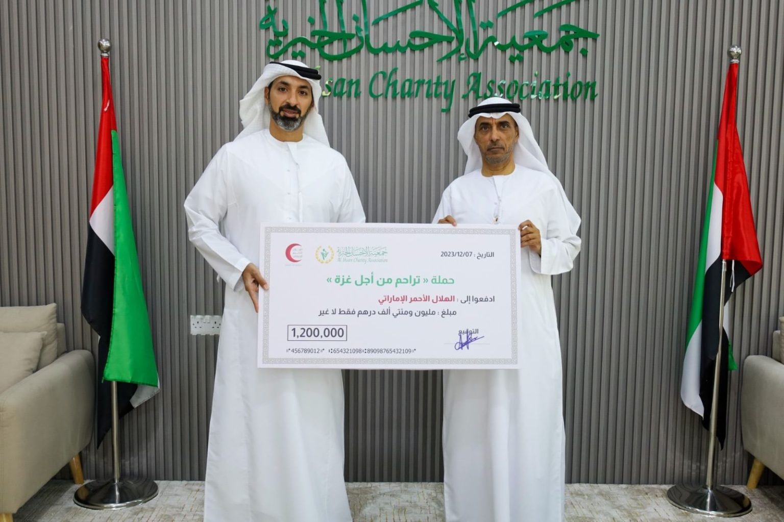 سلم سعادة الشيخ راشد بن محمد بن علي بن راشد النعيمي، المدير العام لجمعية الإحسان الخيرية، وفداً من هيئة الهلال الأحمر الإماراتي، يضم محمد عمر الشمري، مدير مركز عجمان وسلطان جمعة السويدي رئيس قسم التبرعات بالمركز.. شيكاً بمبلغ مليون ومئتي ألف درهم، لمصلحة حملة “تراحم من أجل غزة”، وذلك في مقر الجمعية بإمارة عجمان.