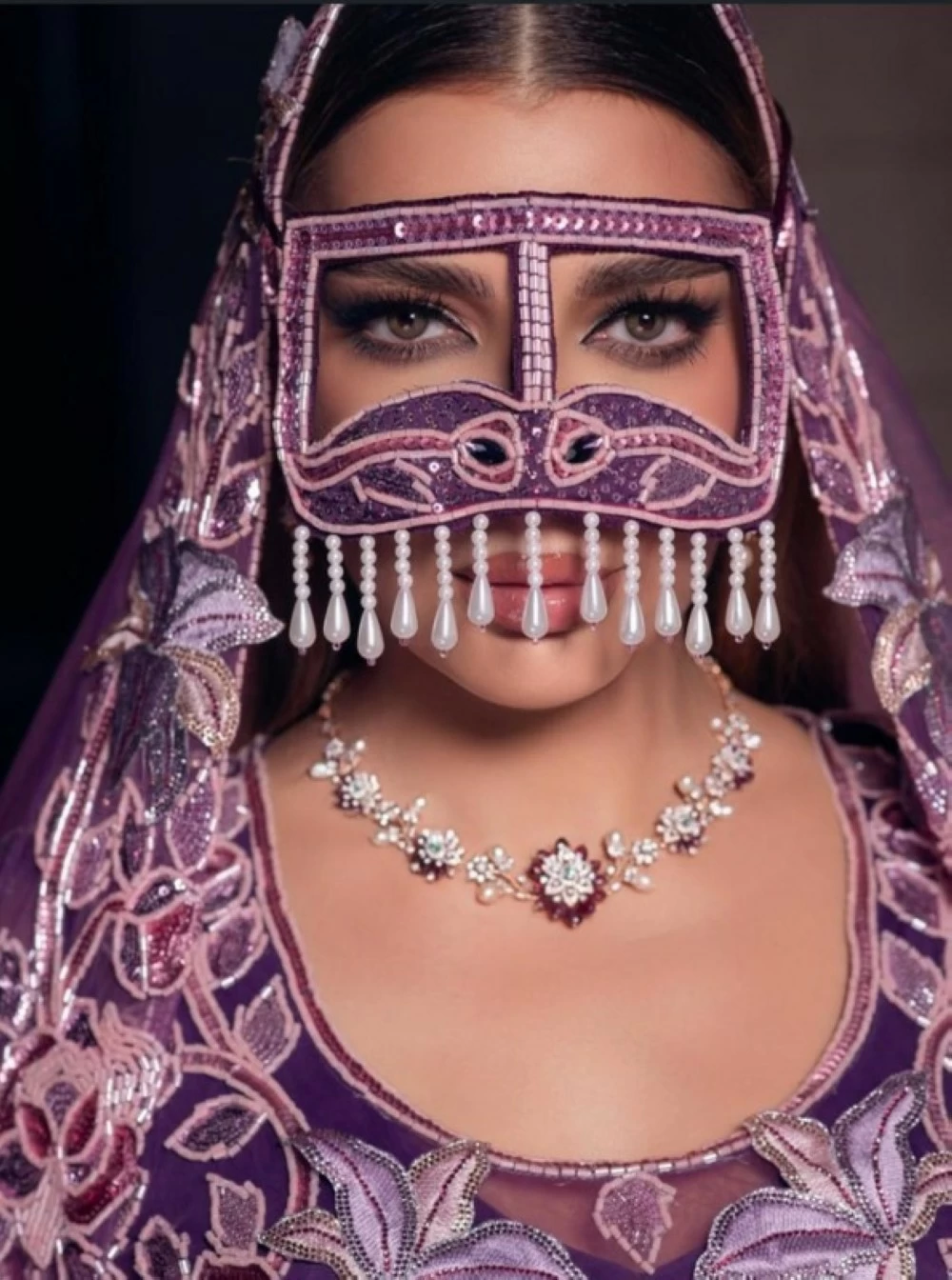 العنصر الأكثر تميزًا في إطلالة أصالة كان غطاء الوجه المستوحى من البرقع التقليدي. هذا الغطاء، المطرّز بعناية مع خيوط متدلّية، أضاف بعدًا احتفاليًا ودراميًا إلى الإطلالة. لم يكن الهدف من هذا الغطاء هو إخفاء الوجه، بل كان بمثابة إشارة ذكية إلى الجذور الثقافية الخليجية بأسلوب مُحدّث.