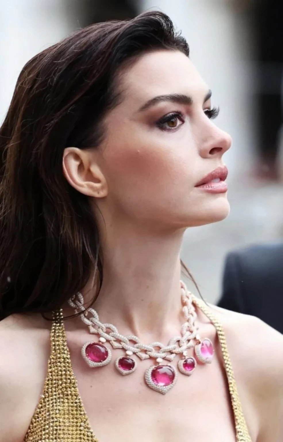 لم تكتفِ آن هاثاواي بالفستان المذهل، بل أضافت لمسة فاخرة من خلال اختيار مجوهرات من دار بولغاري العريقة. المجوهرات انسجمت تمامًا مع روح الإطلالة، دون أن تطغى على الفستان أو تنافسه. كانت القطع براقة وأنيقة، وأضافت عمقًا للإطلالة بشكل عام.