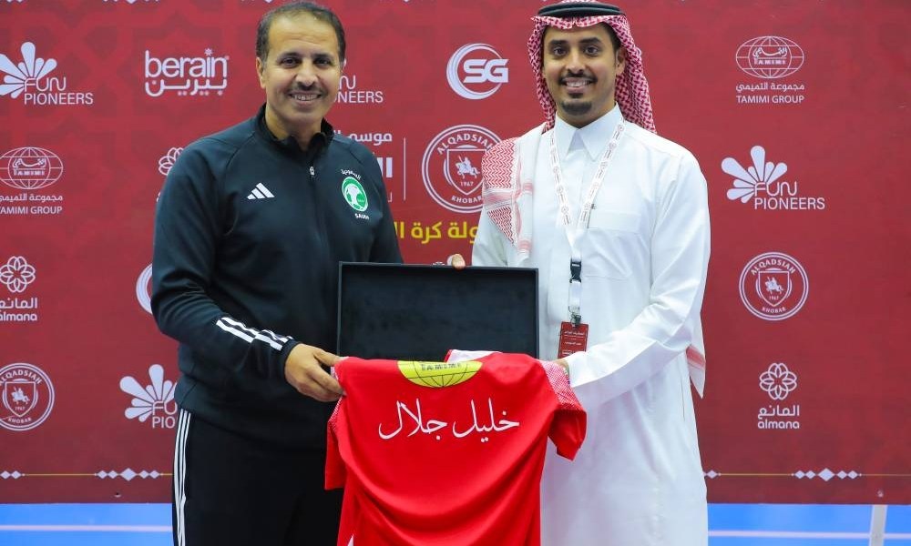 كرم المشرف العام على موسم القادسية الرمضاني فهد الصيعري، مدير دائرة التحكيم بالاتحاد العربي الحكم خليل جلال.