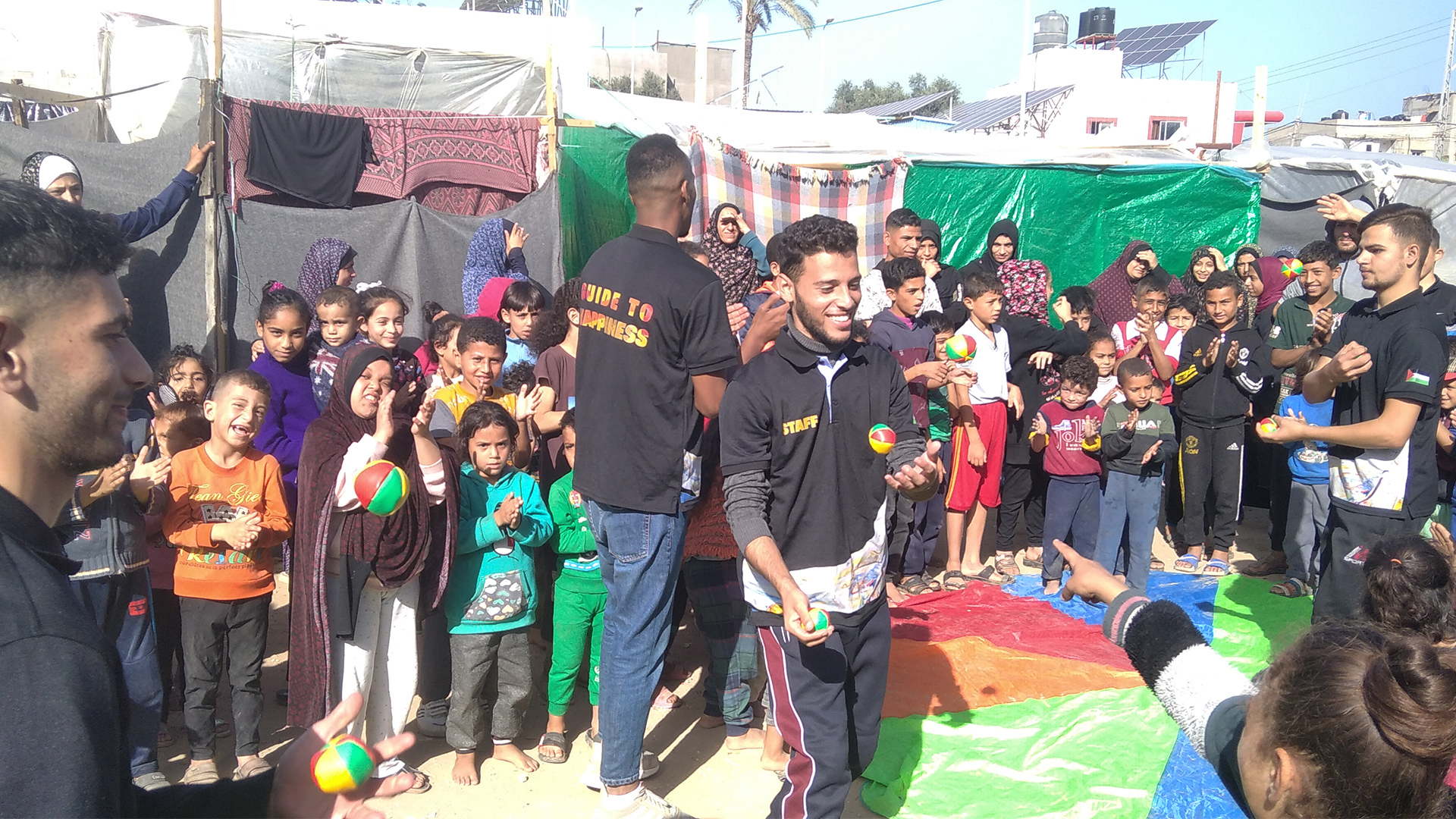 وفي مركز إيواء عشوائي، أقامه النازحون في ساحة مستشفى شهداء الأقصى، بمدينة دير البلح، وسط القطاع، قدم الفريق، يوم الخميس 23 نوفمبر/تشرين الثاني الجاري، عرضا ترفيهيا نال إعجاب الأطفال وذويهم.