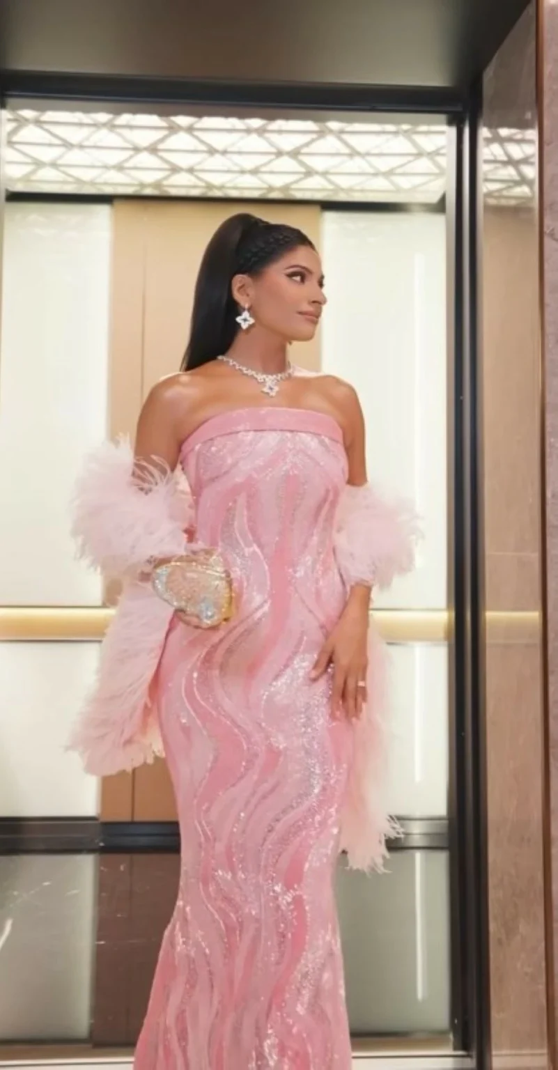 اختارت فرحانة بودي فستاناً وردياً فاتحاً، يعتبر لوناً رمزياً للأنوثة والبهجة، وهو ما يتناسب تماماً مع أجواء الاحتفال بعيد الميلاد. لم يكن الفستان مجرد قطعة ملابس، بل تحفة فنية مطرزة بتفاصيل دقيقة وناعمة، مما أضفى عليه لمسة من الفخامة والرقي.