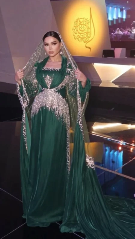 تميز الفستان بقصة أنيقة تبرز جمال قوام فرحانة، مع اهتمام خاص بالتفاصيل في منطقة الصدر والأكمام. الخامة المستخدمة كانت فاخرة وعالية الجودة، مما ساهم في إبراز جمال التطريز ولمعانه. الفستان لم يكن مُبالغاً فيه، بل اعتمد على البساطة والأناقة في التصميم، مع التركيز على التفاصيل الراقية.
