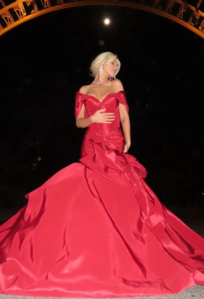 اختيار اللون الأحمر للفستان لم يكن عشوائيًا. فالأحمر هو لون القوة والشغف والجرأة، وهو ما يعكسه أسلوب كريستينا أغيليرا بشكل عام. كما أن هذا اللون يخلق تباينًا لونيًا قويًا مع اللون الرمادي الفاتح لبرج إيفل، مما جعلها محط الأنظار في كل صورة. هذا التباين البصري ليس مجرد جمالي، بل هو أيضًا أداة قوية في عالم التصوير والموضة لجذب الانتباه وإبراز جمالية الموضوع.