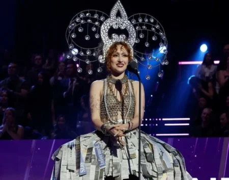 ظهرت جينر بفستان أحمر كرِيمزون ذو قصة بدون أكتاف، بتفاصيل كشكش (ruffles) وذيل خفيف، نسّقته مع قفّازات سوداء شيفون طويلة وأقراط ألماسية لافتة.