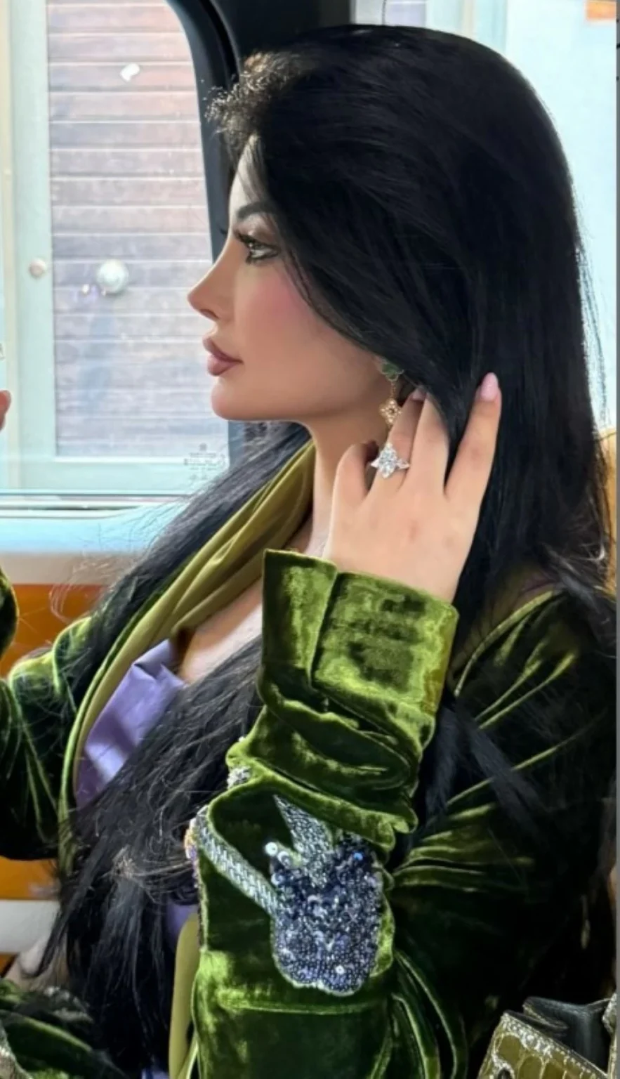 لم يقتصر جمال الإطلالة على اللون، بل أضافت التفاصيل الدقيقة لمسة سحرية لا تُنسى. التطريز الوردي الذي زيّن عباية مخمل لم يكن مجرد زخرفة عشوائية، بل كان عنصرًا جماليًا مدروسًا بعناية. توزعت الزخارف بأسلوب متوازن، مانحة العباءة أنوثة شاعرية، في الوقت نفسه، كسرت حدة اللون الأخضر الداكن وأضفت عليه حيوية طبيعية.