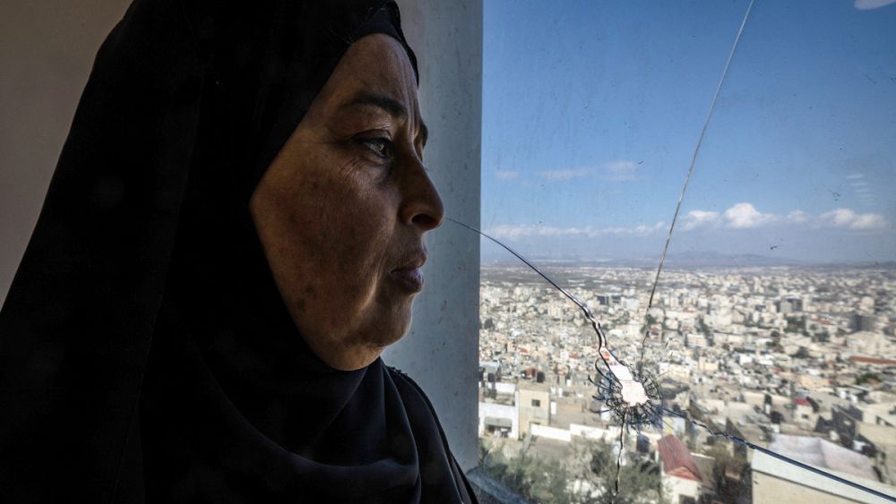 تجلس المرأة عند نافذة تطل على مخيم جنين البالغ الاكتظاظ، وتقول إنها توقفت عن الأكل منذ مقتل زوجتها إثر إصابته في القلب في وقت سابق هذا الشهر.