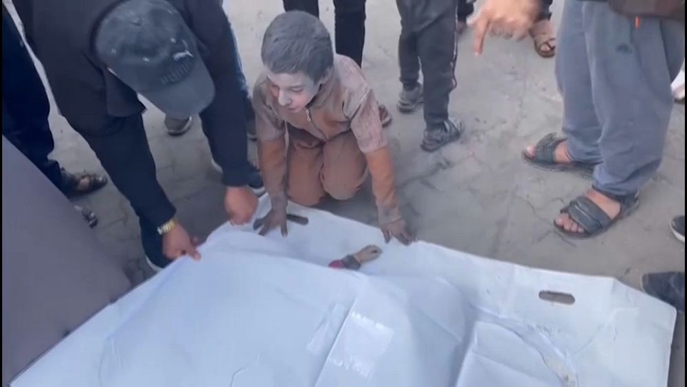 بين الأكياس البيضاء التي تضم جثامين القتلى، يقف الطفل سعيد خالد شحاتة بالقرب من رجل يحمل جثة شقيقه محمد الذي قتل بالقصف الإسرائيلي ويبكي.