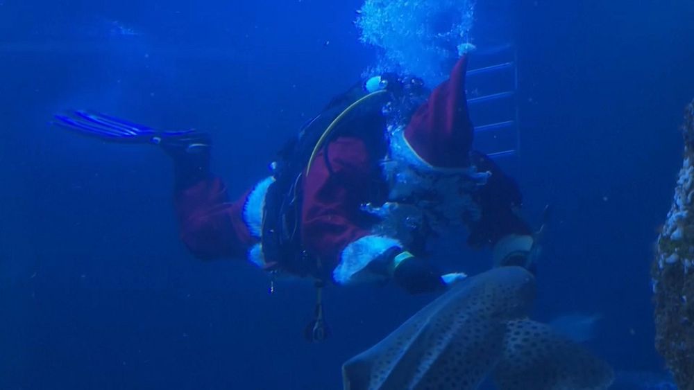 قام سانتا كلوز بالغوص في حوض للكائنات البحرية لإطعام الأسماك بما فيها أسماك القرش احتفالا بعيد الميلاد في مدينة أوبرهاوزن بغرب ألمانيا.